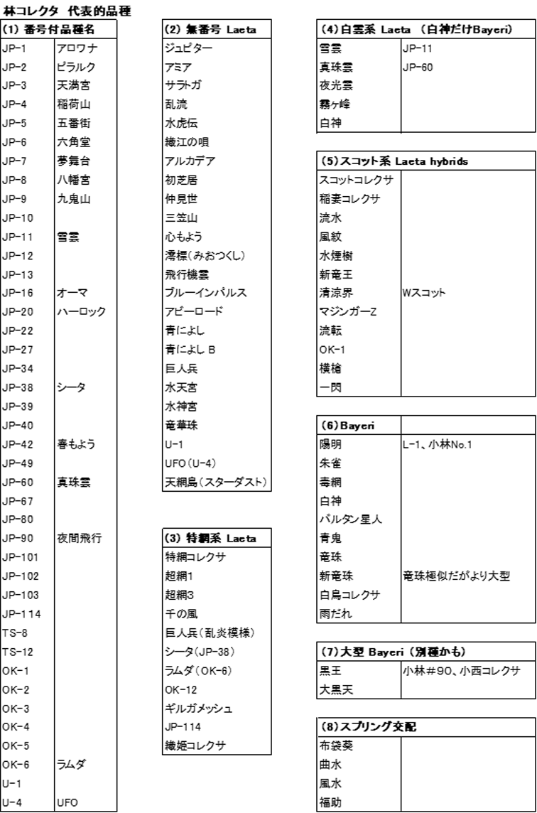 私(林)はコレクタ、特にジュノー系(ジュピター実生)の育種に長年取り組んできたが、その多くは番号で整理されている。整理の仕方は万象の山本氏とほぼ同じで、実生して一定の大きさになった時に親や出所の記号(アルファベット)と番号を順につけ、特に良いものは品種名を付ける。中には整理番号なしで品種名が付けられものもある。次の表 (1) が林コレクタの整理番号と品種名で、表(2)は無番号の名品、表(3)以降はそれらをグループ別にまとめたものである。一つの品種がいくつかの表に重複して出ている場合もある。