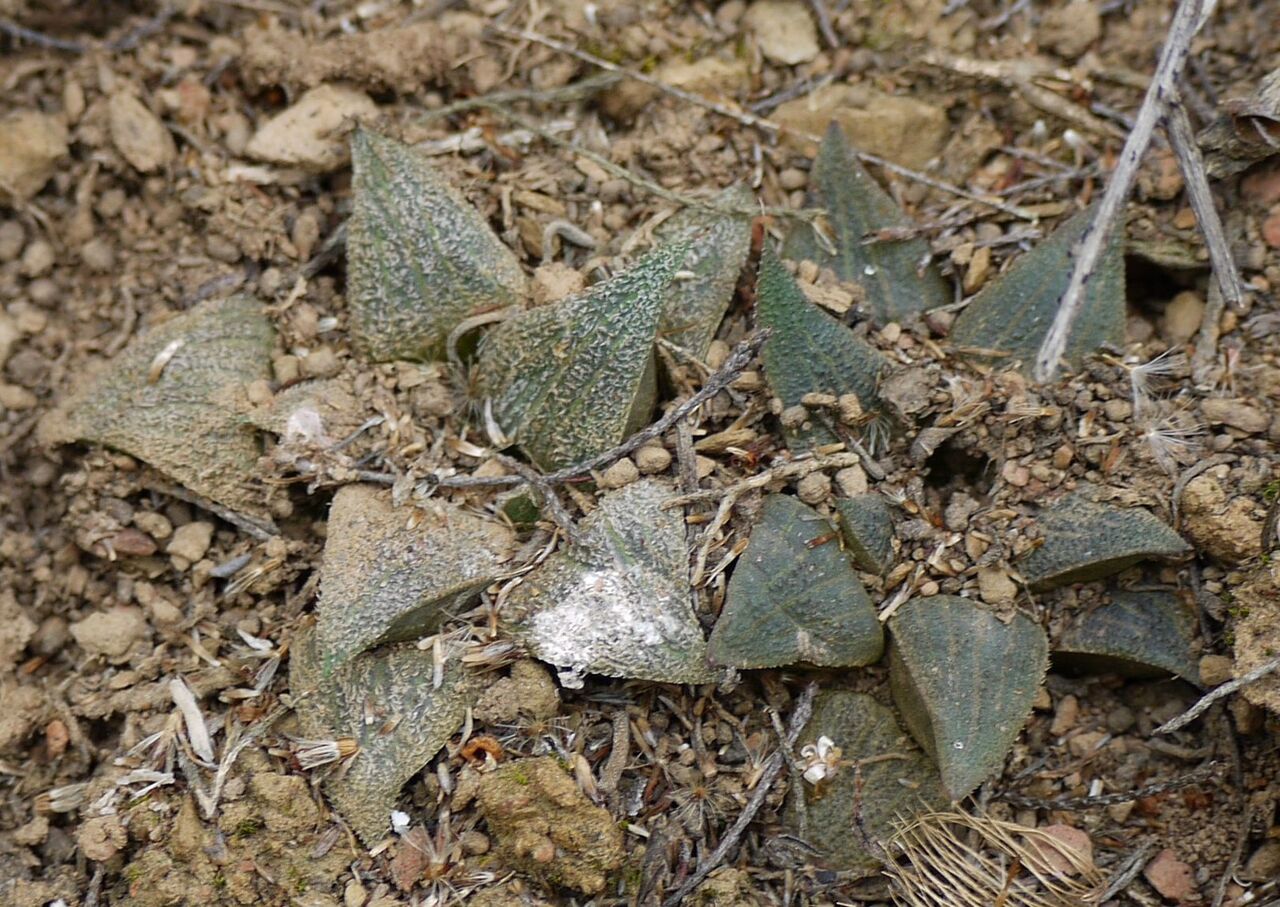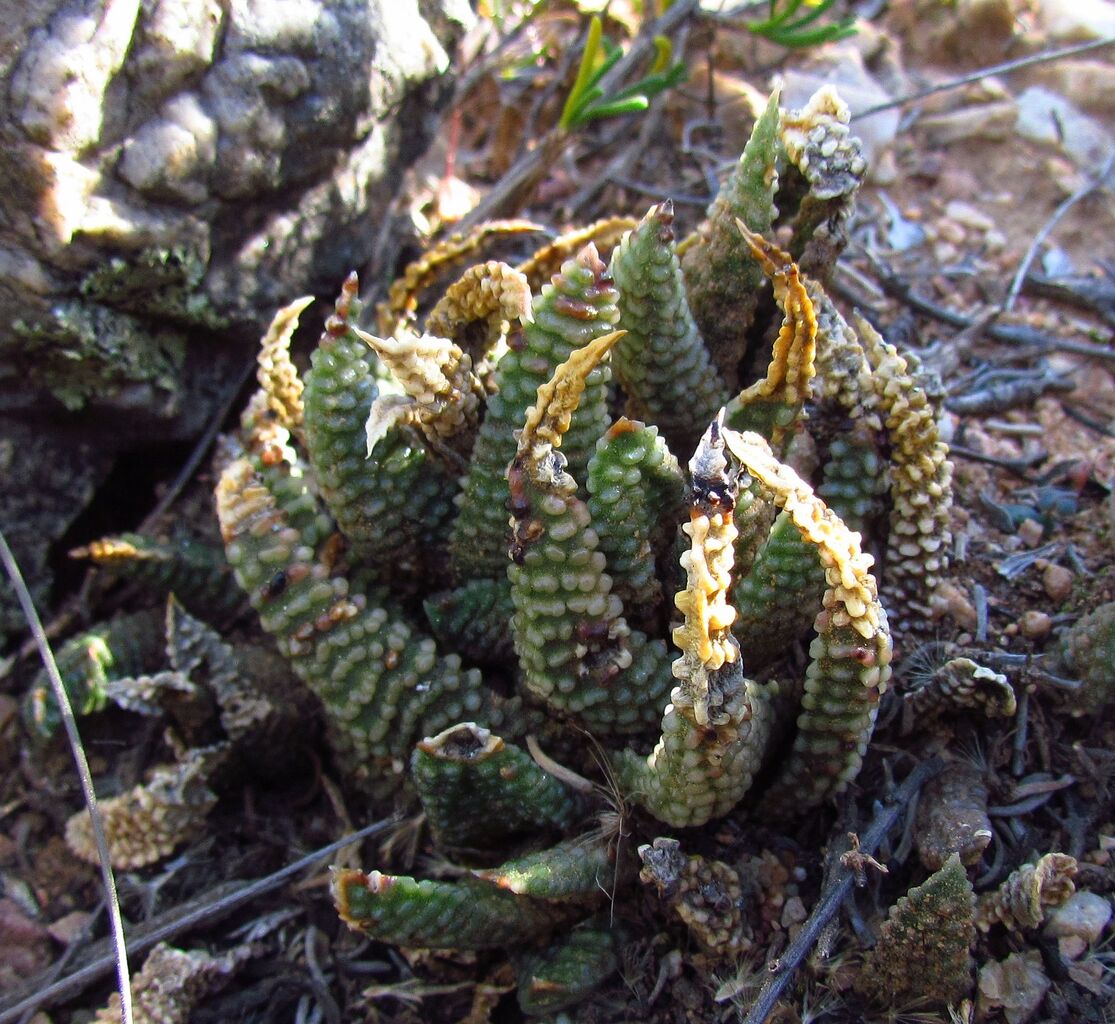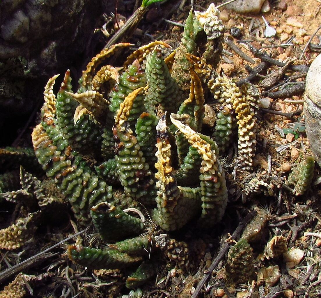 一方H. minimaの内、HeidelbergからMossel Bayにかけての海岸地方の小型個体の群落では花茎はH. maxima(冬の星座など)よりはるかに細く、大型のH. tessellataとほぼ同じ太さである。これが西側の内陸部に産地を広げるにつれ、植物体は大型化し、花茎もより太く頑丈になる。そしてH. minimaからH. poellnitzianaを経てH. maximaに移行するとRobustipedunculares 亜属(=Tulista)に典型的な太い花茎になる。