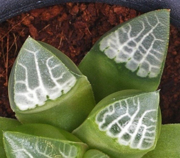 窓模様には、点紋系、線紋系の他、まだら紋系があります。おおむねパリダやレテキュラータ系の表皮の厚いグループと、バリエガータの子孫である、表皮の薄いノルテリーなどのグループに分けられます。またヘロデアの子孫の、葉質の硬いクリスタリナなどもあります。